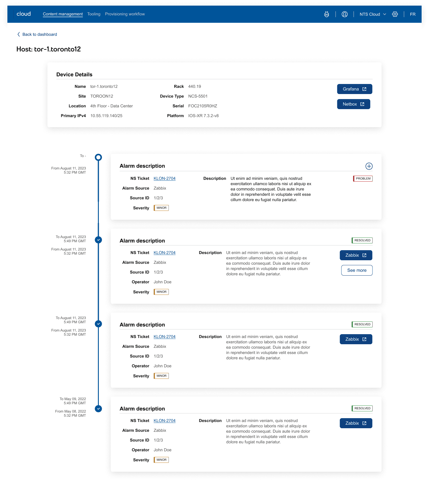 Instead of jumping between systems, the team can now see the alarm, the affected device, related tickets, and technical context side by side. Because the V1 scope of this design was limited to data enrichment, we included pathways for users to jump back into their original tools to take action, with plans to integrate actions in future enhancements.